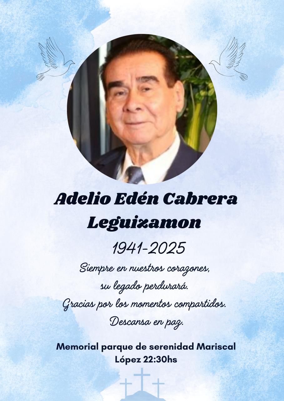 Parque Serenidad participa con mucho pesar la partida deAdelio Eden Cabrera LeguizamonAcompañando a familiares y amigos en este momento de dolor ante tan grande perdida, los invitamos a compartir unas palabras en su honor. |