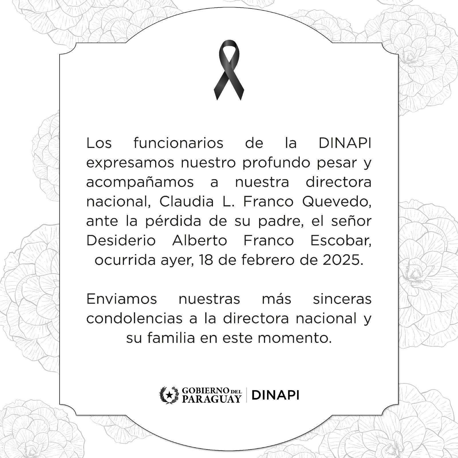 funcionarios de dinapiNuestras condolencias a la Directora Nacional, Claudia L. Franco Quevedo por la pérdida de su padre. ![]() |